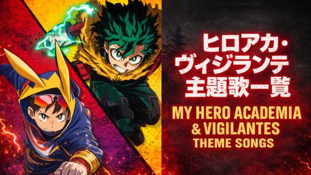 キャラ名鑑 ヒロアカ・ヴィジランテ主題歌一覧【OP・ED全曲まとめ】歴代テーマソングを放送順で紹介 2026年3月20日 japtomato 『僕のヒーローアカデミア』とスピンオフ作品『ヴィジランテ』には、物語を彩る数多くの主題歌が存在しており、聴くだけでシーンがよみがえるものば …