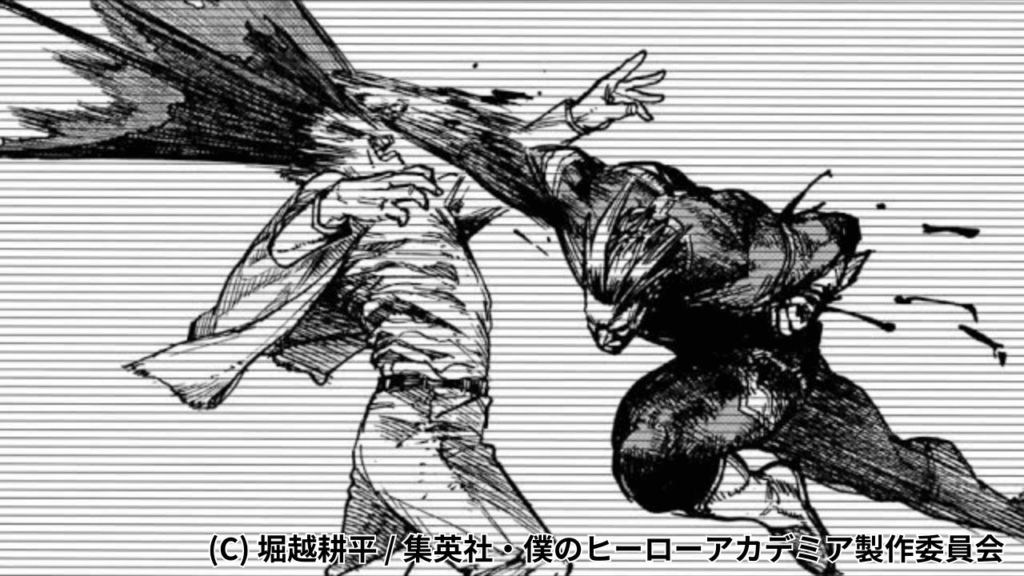 『筋骨発条化』+『瞬発力×4』+『膂力増強×3』+『増殖』+『肥大化』+『鋲(びょう)』+『エアウォーク』+『槍骨(そうこつ)』を使用してオールマイト並みのパワーを得ることができる。最大威力で放たれるこの攻撃は、相手の全力の迎撃を衝撃反転によって返すカウンター性まで内包している。
