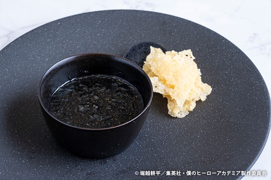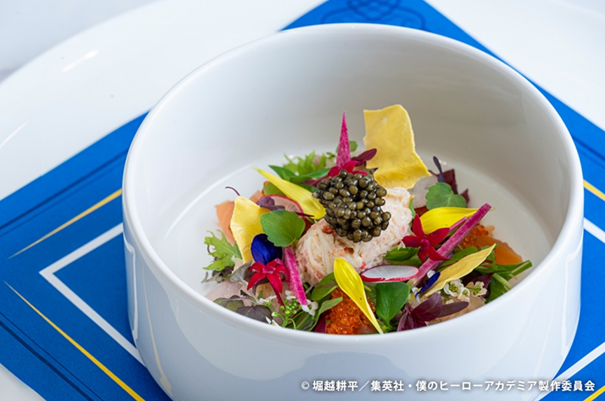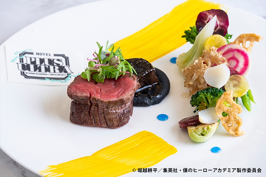 渋谷の街並みを一望できる25階のフレンチレストラン「ア・ビエント」では、ヒロアカの世界観を表現したオリジナルコースメニューを提供。