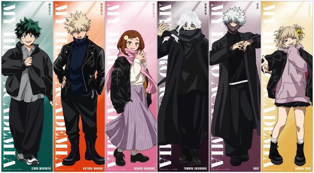 緑谷出久、爆豪勝己、麗日お茶子に加え、死柄木弔、荼毘、トガヒミコといったキャラクターたちが、“黒アウターコーデ”の描き下ろしビジュアルでデザインされた大型アイテムとなっています。