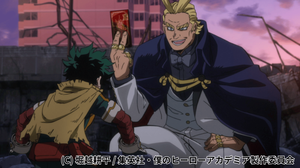 新作劇場版「ヒロアカ ユアネクスト」のメインヴィランとして登場するキャラクターで、ーロッパ最大の犯罪者組織ゴリーニ・ファミリーのボスオールマイトの「次は君だ」という言葉に感化され、次期継承者となるべくオールマイトにそっくりの衣装に身を包んだ。